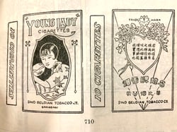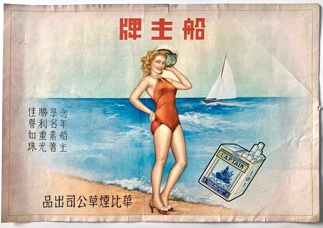 21. August 2019 Ahoy! Captain Cigarettes Advertisement Poster Sino-Belgian Tobacco Co (華比煙草公司), incorporated 1919 at 147 Seward Road, later relocated to 1176 Woosung Road. Brands produced included Young Lady (名妹), Captain Cigarettes (船主 / 克浦), Jockey (新骑师) and 烏牌. tagPlaceholderTags: advertisement, China, advertising, ad, history, poster, vintage, historic, pin-up, cigarettes, pinup, girl Write a comment Comments: 0