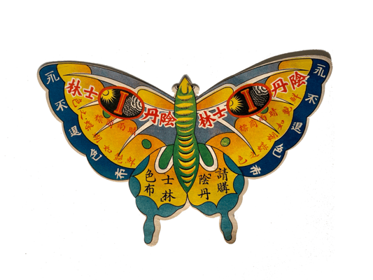 Cut in the shape of a butterfly - "The cloth that never fades". The blue dye was discovered in 1901 by German chemical manufacturer BASF (later shareholder of the IG Farben conglomerate). BASF had