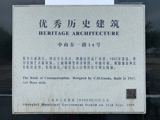 Bank of Communications on the Bund No. 14. The modern Art-Deco style building, combined with Chinese elements, was designed by Austro-Hungarian architect C. H. Gonda. Construction was interrupted in 1937 because of the Second Sino-Japanese War and it was only completed by 1948 making if the last classic building to be erected on the Shanghai Bund.
