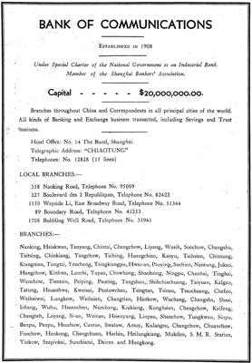 The Bank of Communications was founded in 1908 and emerged as one of the first few major national and note-issuing banks in the early days of the Republic of China.