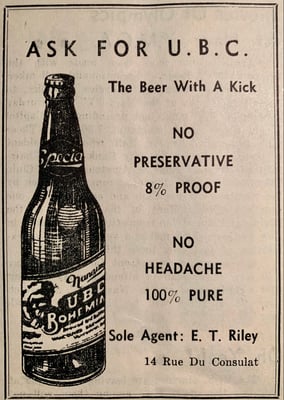 If you’ve read Paul French‘s excellent book City of Devils you of course heard of famous Shanghai slot machine king “Jack” E.T. Riley. Jack was known to have been a longtime supporter of the Marines, and they in turn helped save his butt more than once. What, to our knowledge, previously was not known is that before joining spirits merchant Gande, Price & Co in late 1933 (where his “commercial record was above reproach”), Jack gave it a shot on his own to distribute U.B.C. – “The Beer With A Kick”: 8%, no headache, 100% pure. Paid advert from the Shanghai Marine’s weekly magazine Walla Walla, June 10th 1933.