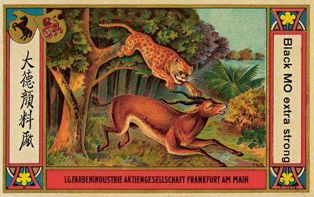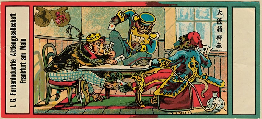 A significant part of I.G. Farben and its predecessor’s success in China can be attributed to their brilliantly colored labels and advertising posters. The designers of the colorful graphics let their imaginations run wild, depicting a wide range of real world as well as fantastical scenes. We have to remember that during Qing Dynasty and Republican China literacy rate was only approx. 15% and so customers, most of whom were not able to read Chinese characters, could recognize their preferred product with the help of memorable colors, symbols and motifs.