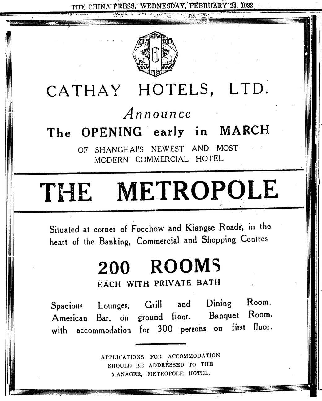 Cathay Hotel opened August 1929