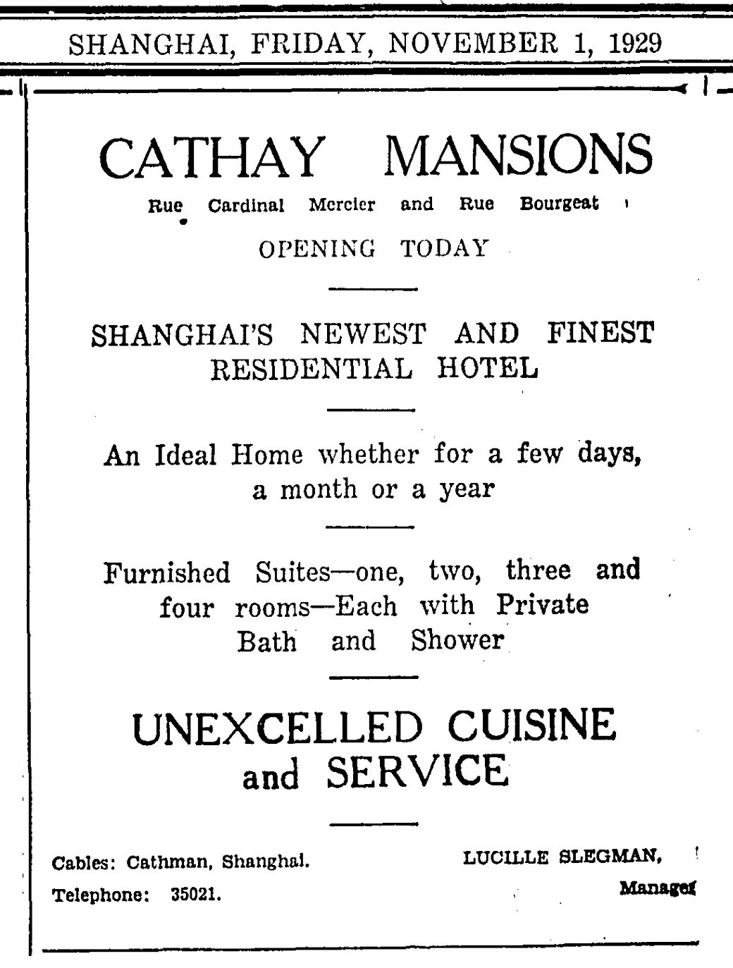 Cathay Mansions opened November 1929