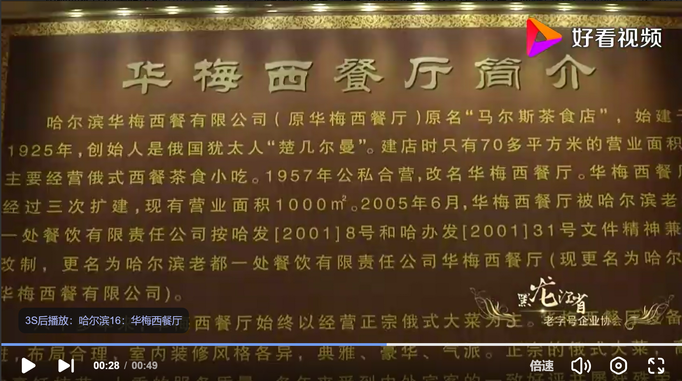 Today it still exists as the popular Hua Mei Western Restaurant (华梅西餐厅) at the same location, now No. 112 Central Street (中央大街的中心112号), and continues to serves Russian dishes and beverages.