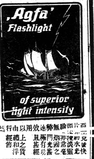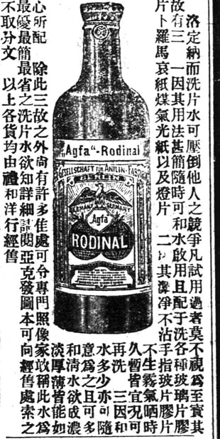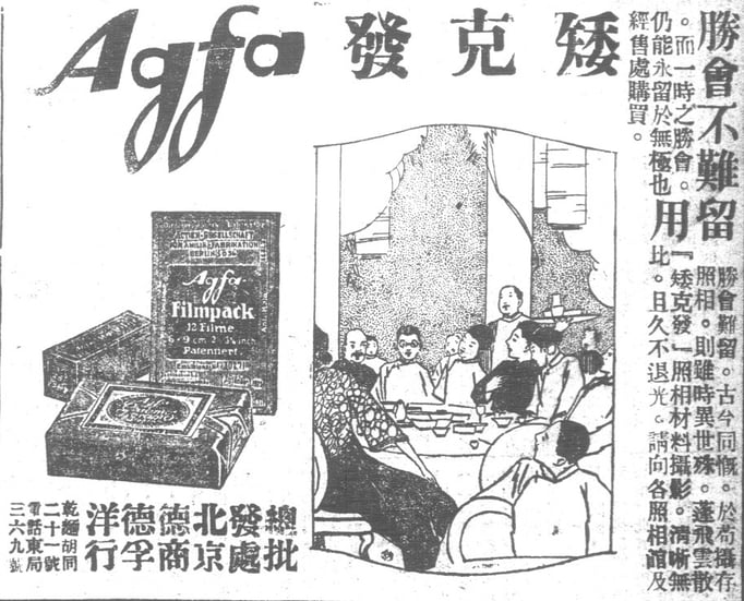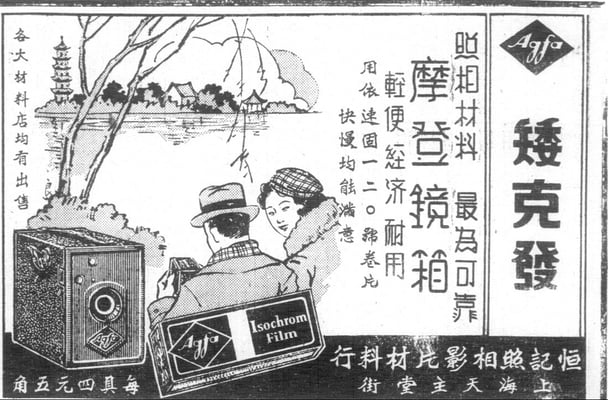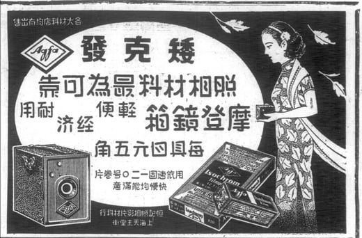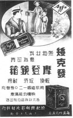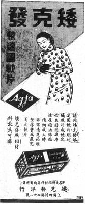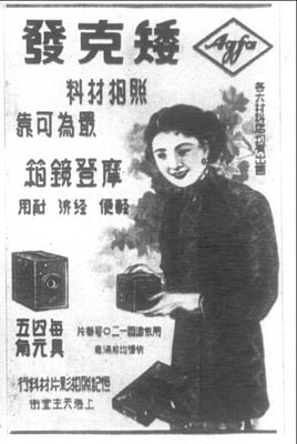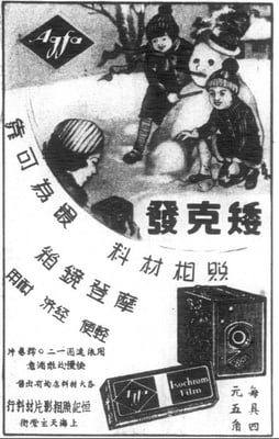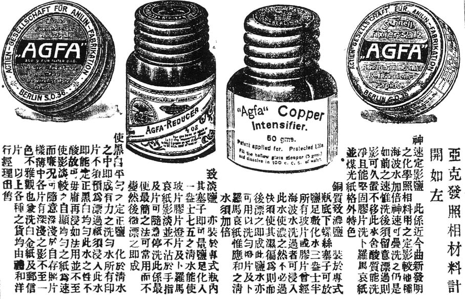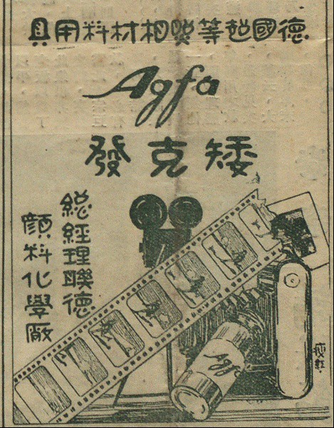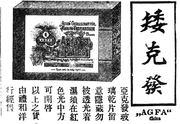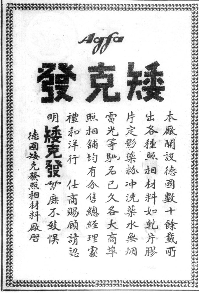 Under the Chinese name Ǎikèfā (矮克发), Agfa soon followed suit and started to market its brand in 1910. The German company however limited its advertisements to professional photo development chemicals, papers and tools.