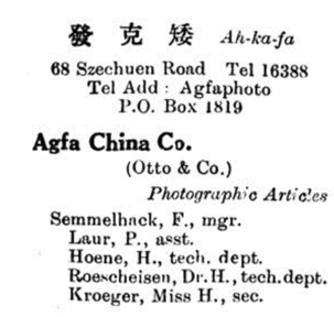 Two years later, in around 1929, Agfa formally incorporated its first representative office in China, the Agfa China Co. in Shanghai, emphasizing the importance of the growing Eastern market.