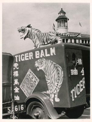 After establishing his own newspapers to promote Tiger Balm, Boon Haw came up with even more creative marketing ideas that were almost unheard of in his time. One such tactic was converting his stable of cars into „Tiger Cars“, which attracted plenty of attention wherever he went, and typified his flair in promoting his business. Each car was painted with tiger stripes, a tiger head with whiskers and fangs covering the radiator, red bulbs for the tiger’s eyes, and even the sound of the horn resembled a tiger’s roar.