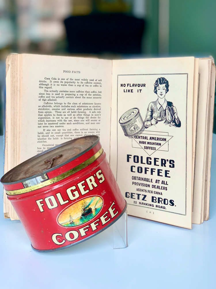 Taken from the book "Food Facts" published by The Shanghai Times. J.A. Folger & Co. was established 1850 in San Francisco as Wm. H. Bovee & Co and was the first coffee brand to offer roasted and ground coffee ready for brewing. Procter & Gamble acquired Folger's in 1963 and during that time became the number one coffee brand in America. The "Agent for China", Getz Bros. mentioned in the ad was also founded in the 1850s in California by Joseph and Max Getz. By the 1870s, the brothers...