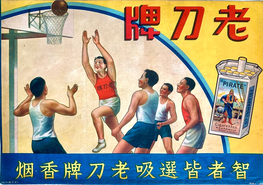 "Wise men all choose to smoke Pirate cigarettes". They apparently are also awesome at basketball... 1930s ad poster from British American Tobacco (BAT) brand Pirate cigarettes.