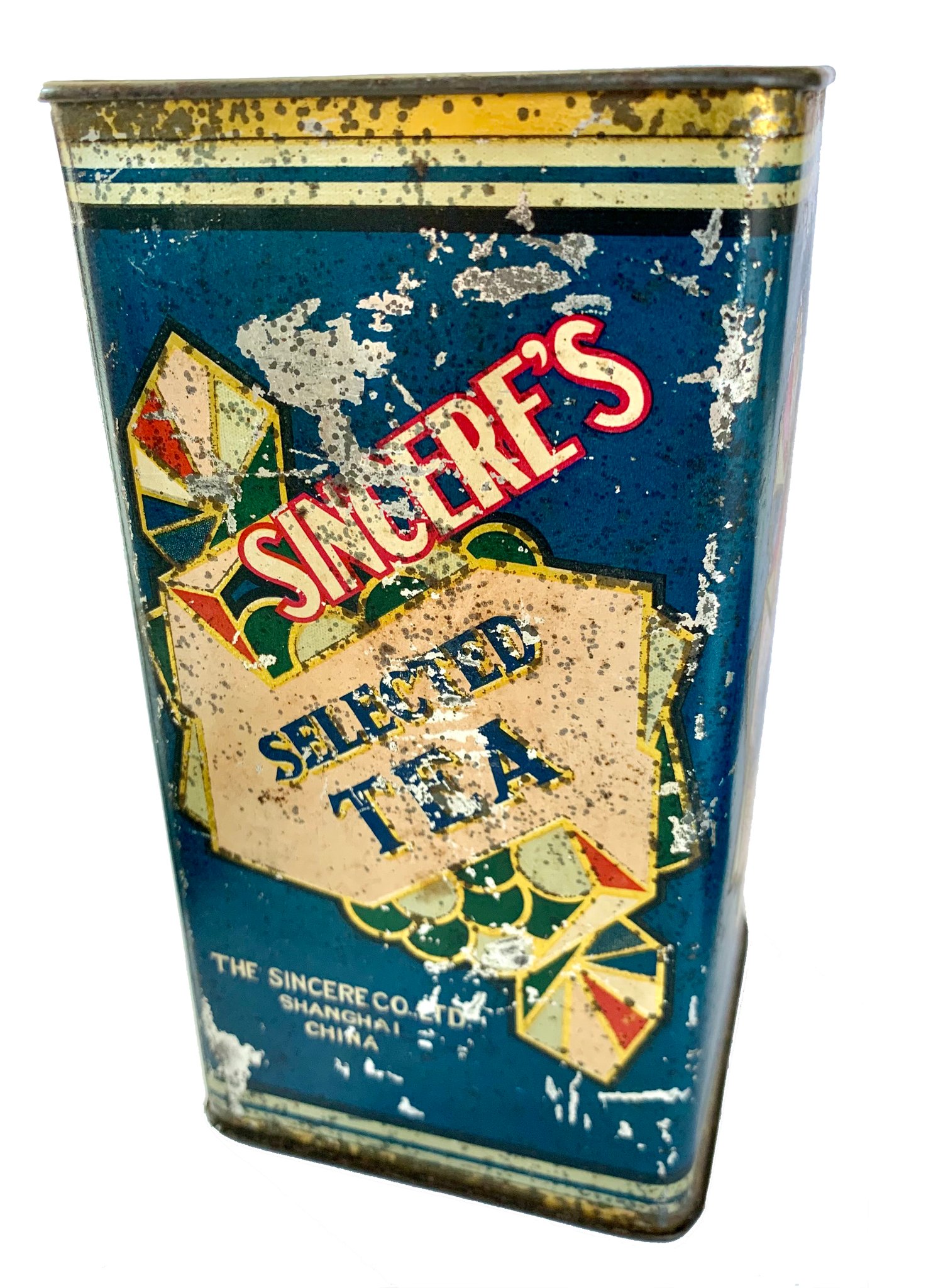 A beautiful (and unopened!) art-deco design tea tin of "Selected Tea" by the Sincere Co. Shanghai. Sincere was the first Chinese-owned department store in Shanghai, opened in 1917. It was also the first of the "4 Big Department Stores" of Old Shanghai, followed by the Wing-On, the Sun Sun and the Sun. The relentless competition between them spurred modern retail innovations throughout the 1920s, 30s and 40s, such as in this case consumer packaged goods under "Sincere's" own private label brand...