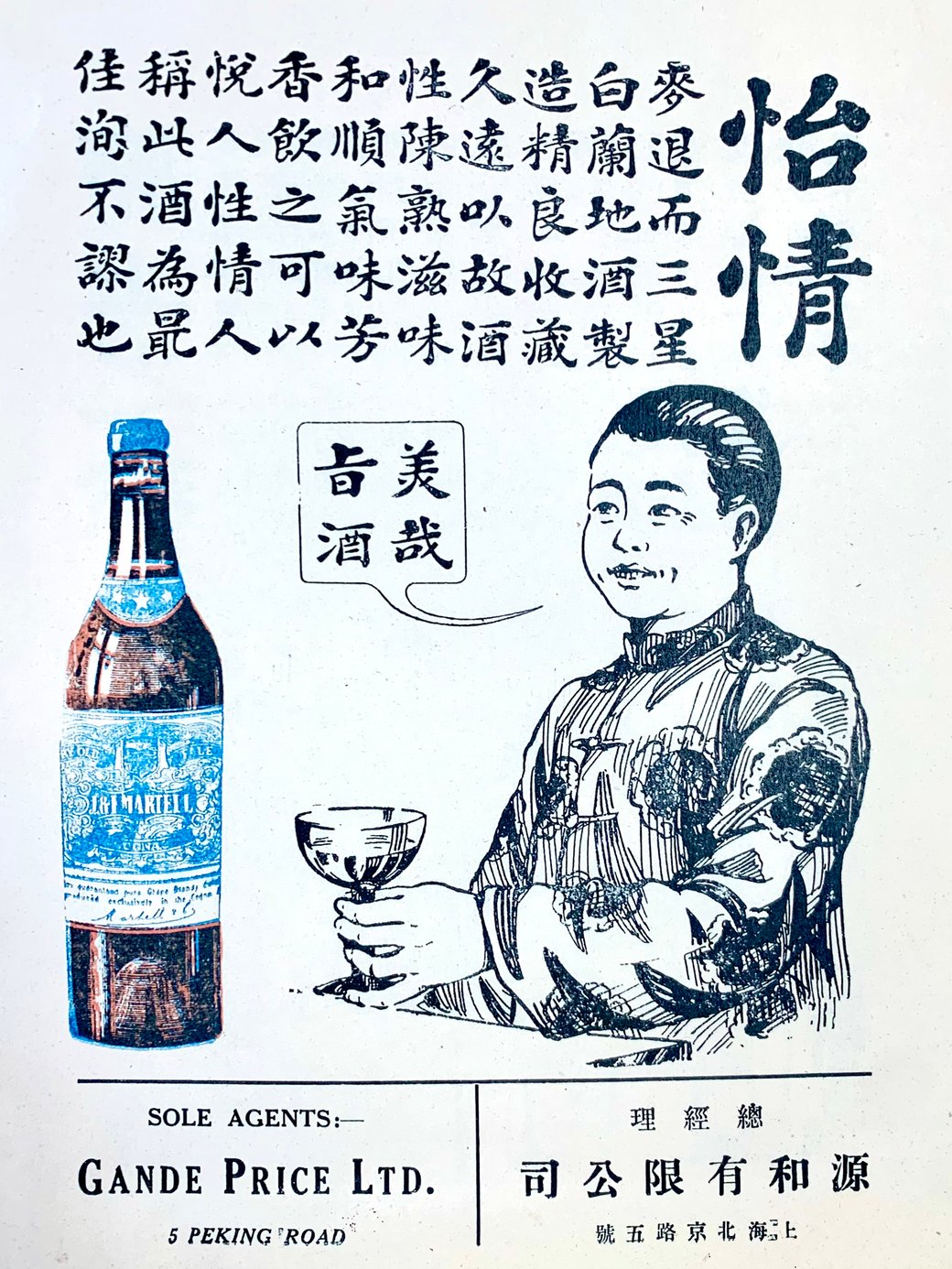 Interesting to note that Martell’s Chinese brand name then still was 麦退而, based on the Shanghainese pronunciation “Mah-r-the”, in comparison to its modern day transliteration 马爹利 pronounced “Madieli” in Mandarin. Founded in 1715, Martell is the oldest of the great cognac houses and its original Chinese name was first mentioned in an 1872 Shun Pao newspaper article. Gande, Price & Company Ltd were wine and spirits merchants founded in 1892 with branches in Hong Kong,...